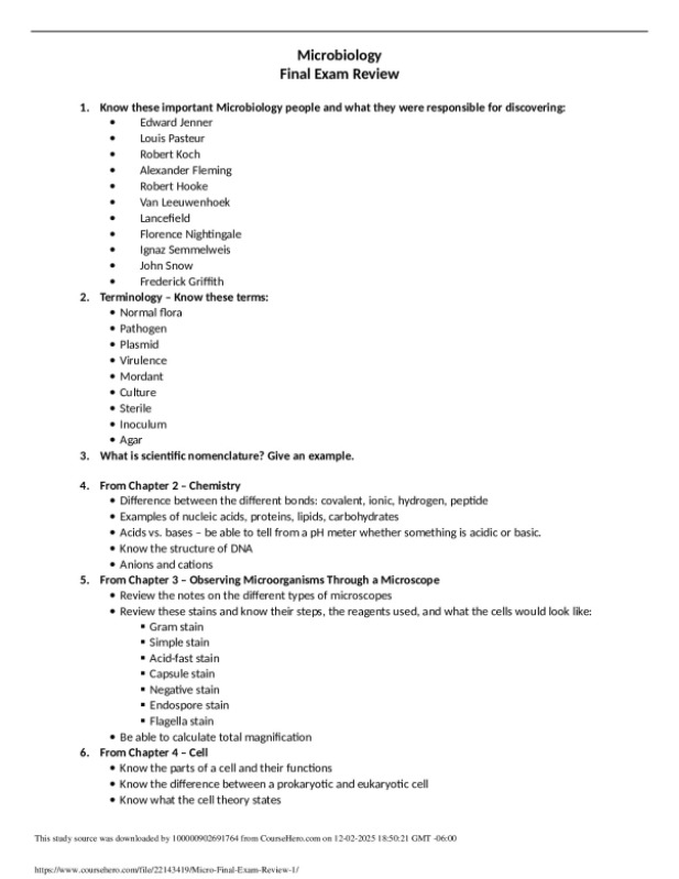 Meridian Community College BIO 2921 1. Know these important Microbiology people and what they were responsible for discovering: Edward Jenner Louis Pasteur Robert Koch Alexander Fleming Robert Hooke Van Leeuwenhoek Lancefeld Florence Nightngale Ignaz Semmelweis John Snow Frederick Grifth 2. Terminology – Kn ...[Show More]